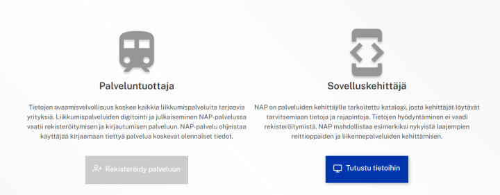 The Traffic Management Company Fintraffic maintains and operates the FINAP service. The service is intended for the publication and digitisation of traffic services’ essential information. These services include public transport, taxi and train traffic and brokering services. The parties responsible for traffic services, such as authorities and companies, publish “essential information” in FINAP. In addition to basic information on companies and services, these include routes, timetables, stops, service areas, service hours, prices and developer interfaces. Opening and sharing of information is based on domestic (e.g., https://www.finlex.fi/en/laki/kaannokset/2017/en20170320) and EU legislation and regulations (e.g., (https://eur-lex.europa.eu/eli/reg_del/2017/1926/oj).
