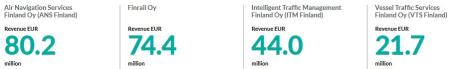 Road, maritime and railway traffic control services, ordered by the Finnish Transport Infrastructure Agency, generated the majority of the revenue, with service sales value of EUR 141 million. Air navigation services sold to airlines amounted to EUR 59.0 million and to Finavia to EUR 16.2 million.
