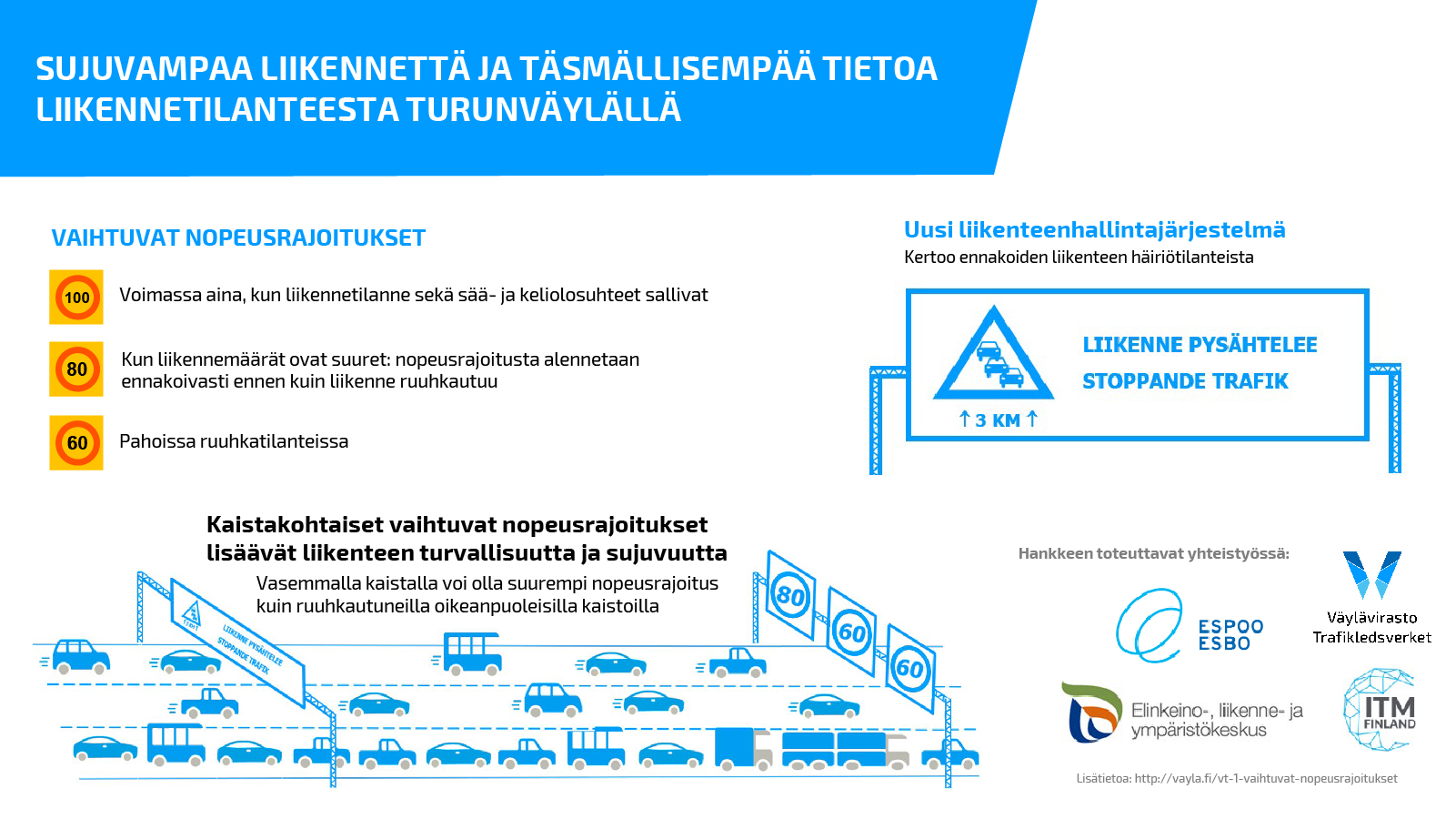 ”Laitteistotestaukset toteutetaan 19.10. - 2.11.2020, jolloin testataan vaihtuvien opasteiden toiminta. Testaukset pyritään ajoittamaan mahdollisimman pitkälti ruuhka-aikojen ulkopuolelle, jolla pyritään minimoimaan niiden haittavaikutukset liikenteelle. Laitteistotestauksien aikana kannattaa kuitenkin varautua osittaisiin kaistansulkuihin”, kertoo ITM Finlandilta Jukka Värri.